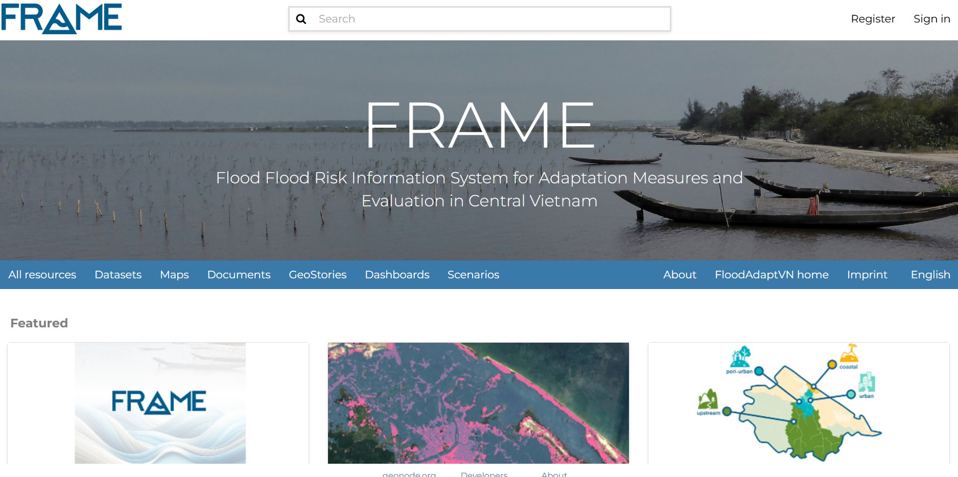 Flood Risk Adaptation Measures & Evaluation (FRAME, https://framefavn.org/) is a modular, web-based decision-support system developed within FloodAdaptVN to enable risk-informed planning and adaptation. FRAME integrates geospatial data, flood hazard models, exposure and vulnerability layers, and adaptation options in an interactive platform. It allows stakeholders to visualize current and future flood risks, compare measures, and evaluate their effectiveness—supporting evidence-based, participatory decision-making for flood risk reduction and climate adaptation.