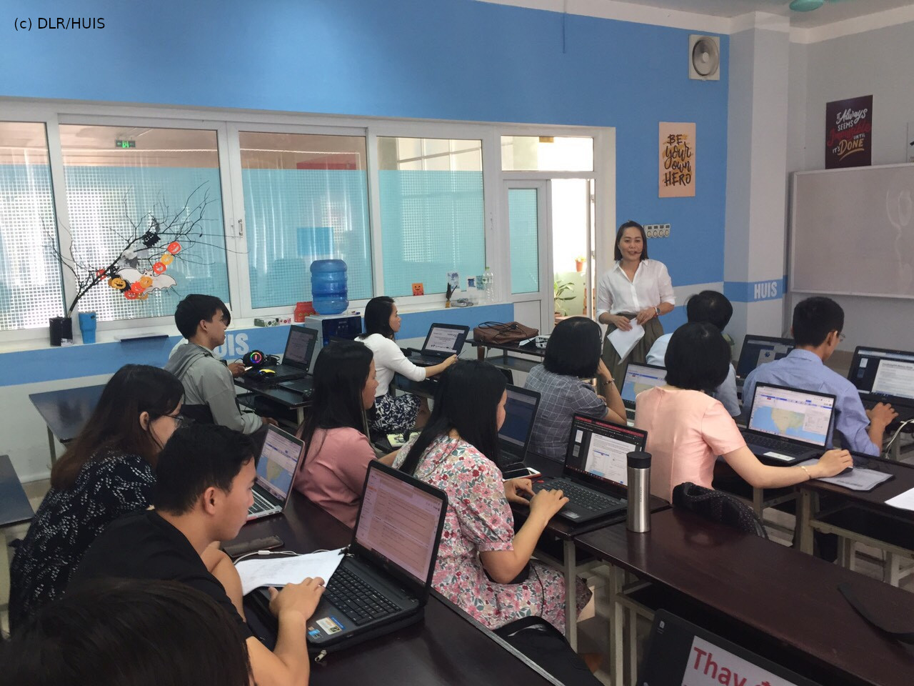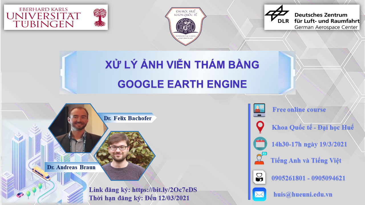 The first event of the knowledge exchange series took place on 19.03.2021. DLR and the University of Tübingen held a three-hour webinar on “Introduction to cloud-based Earth Observation with Google Earth Engine (GEE)” with 25 participants from different Vietnamese universities. Some of the participants were able to attend in a seminar room of the partner HUIS and were directly supervised by HUIS faculty.